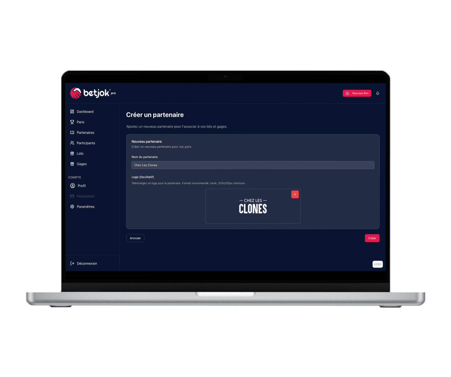 Ajoutez les partenaires et sponsors qui soutiennent votre pari. Associez des lots ou récompenses pour dynamiser la participation. Vous pouvez également télécharger des logos ou images pour mettre en avant vos marques et rendre votre pari plus attractif.