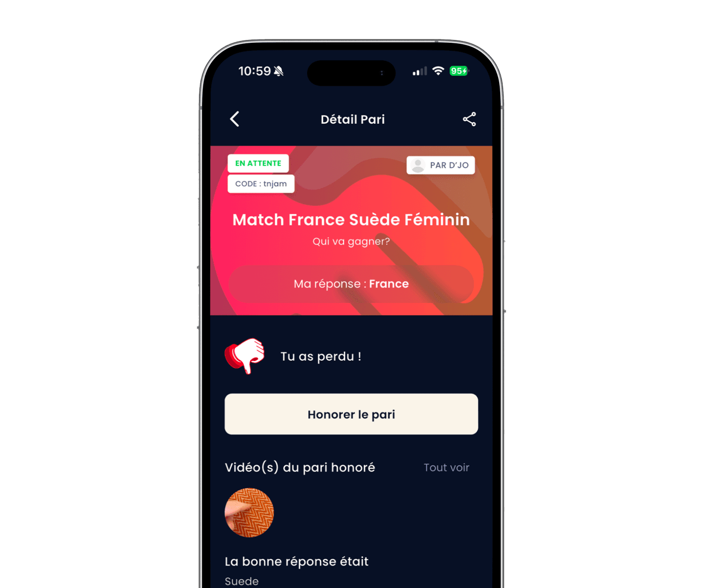 Invitez vos participants et gérez la liste des joueurs. Partagez facilement le pari avec votre communauté : via lien direct, QR code ou code du pari. Vos amis et membres peuvent rejoindre instantanément et participer à l’aventure.